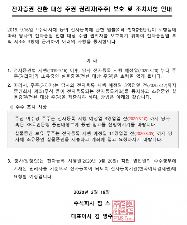 [공고] 전자증권 전환 대상 주권 등의 권리자 보호를 위한 통지 건