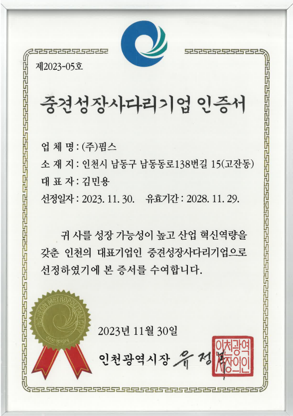 [인증] 중견성장사다리기업 인증서