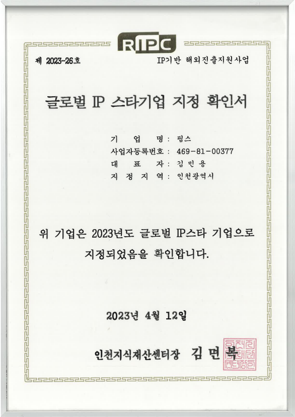 [Certifications] 글로벌 IP 스타기업 지정 확인서